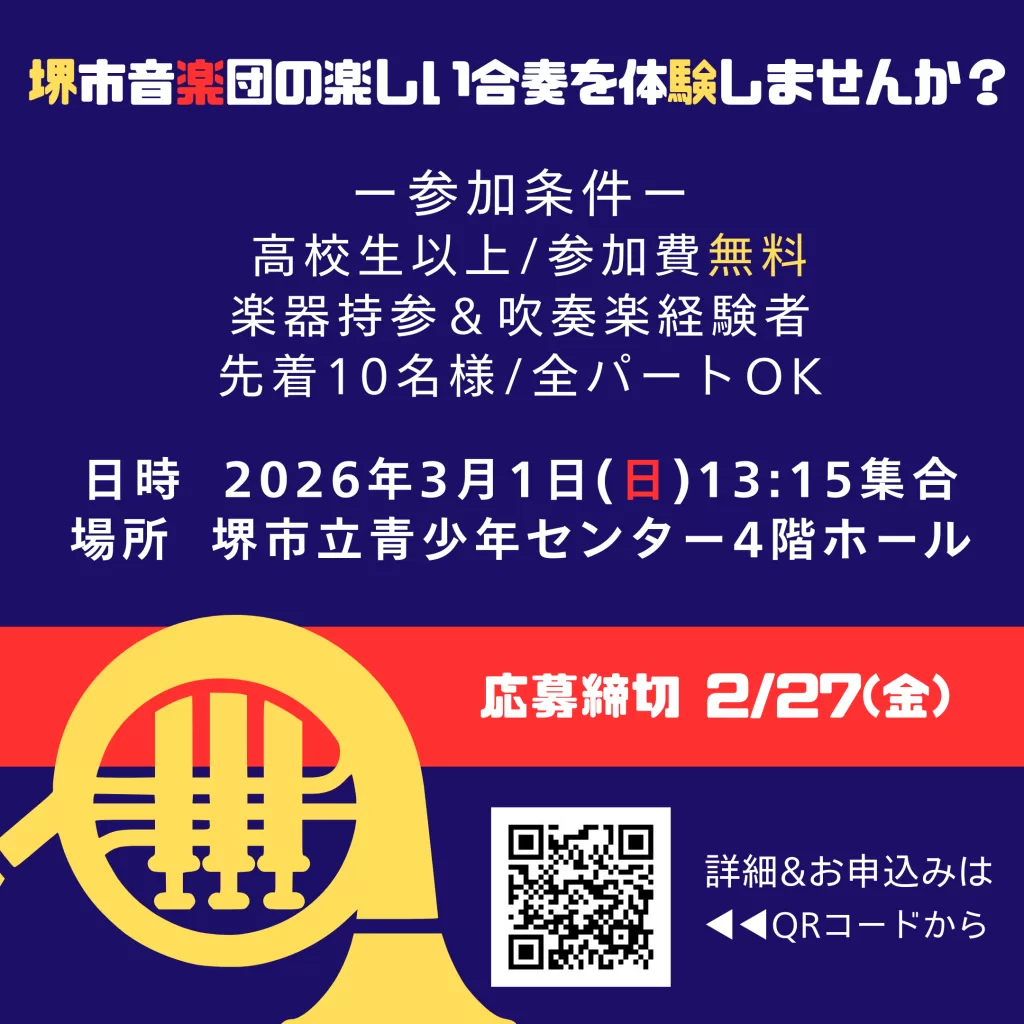 久しぶりに楽器を手に取る方も、現役で活動されている方も、堺市音楽団の合奏の雰囲気をぜひ体験してみませんか?